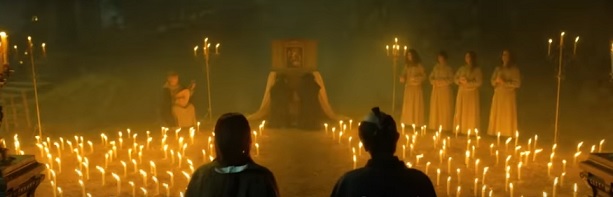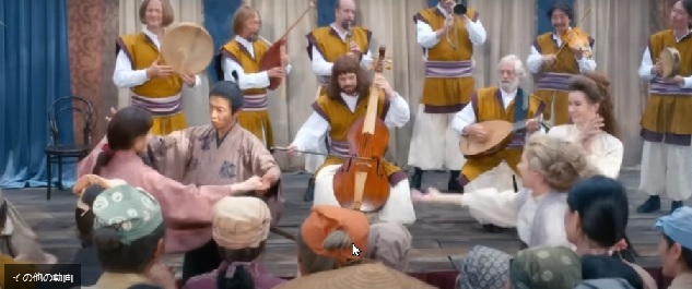 個人的な趣味なのですが、古楽ファンのリュート愛好家の小生にとっては、映画で使われている音楽には満足しています。 大事な場面に古楽やリュート音楽が用いられています。 信長が入京して帰蝶とお忍びで街を歩く場面がある。 南蛮人が南蛮音楽(ルネッサンス音楽)に合わせてダンスをしている。二人はダンスの輪に加わって踊る場面があった。この舞曲のメロデイは覚えているが曲名は分からず。 他に教会の内部の場面でジョスカン・デ・プレのミサ曲・キリエが歌われるシーンがあった。