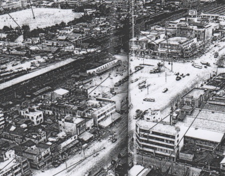 しばらくして現場を訪れてみると、先の予測に不都合なことが起こっていた、御茶ノ水橋よりの斜面の土留め工事が永久工事の様を示している、ここは外側に障壁を線路の高さまで設け埋め立てるはずが、全くの誤算でありホーム幅の問題をどう解決するのか分らない、改めて工事の状況を見ると、上下線のホームにH柱が立ち並び仮設の梁でガッシリと井桁に組まれており、ホームの下がスッカリ掘り取られ足元スカスカになり、コルゲート板が消え失せている、どうやらホーム下の基礎工事に使われていたのだ。