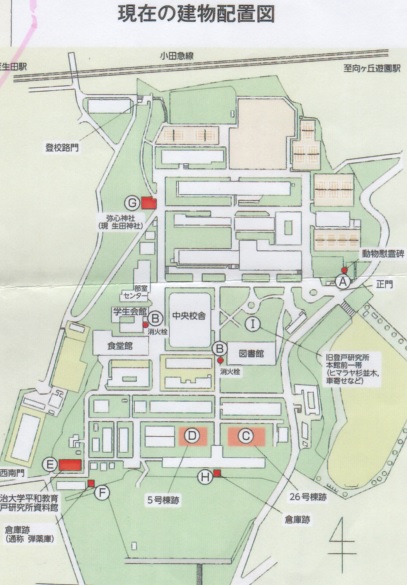 たまたま、熱海で碁の催しがありその帰途を利用して尋ねてみた。小田原で小田急に乗り換え生田駅で下車、線路沿いに徒歩15分程で、キャンパスの裏口に瀟洒な建物があったが、左手奥の守衛所で案内を乞い言はれるままに、標高差20mほどの急坂を登り台地の上に立つ、久しぶりのことでしっかり汗をかいた。案内板があり記念館は構内の最も奥まったところにあり、徒歩7~8分、秘密戦にふさわしい暗灰色のコンクリート一階建て、周りの校舎に比べ小さな倉庫と言った佇ずまいである 当時、研究所の殆どの建物が木造の中、少ないコンクリート造ずくりであり、構内の片隅であったことが幸いしてか、当時の姿をとどめる唯一の存在である。