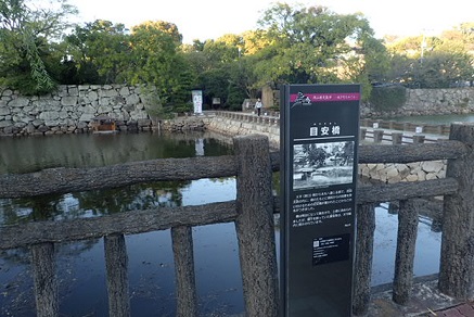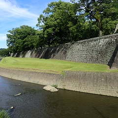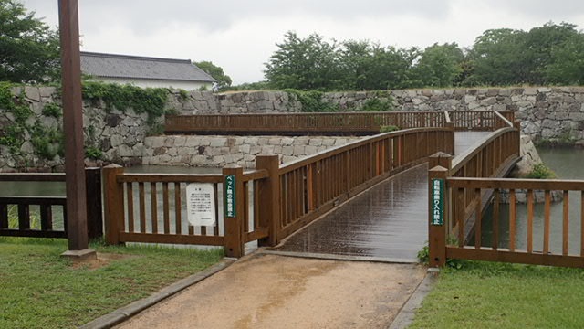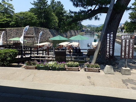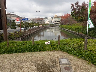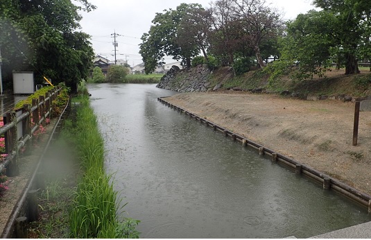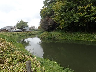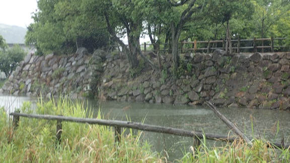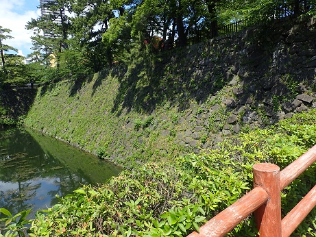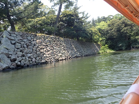 堀は思ったより浅く、底が見える。 橋を通過するにもギリギリのところが3か所もある。 堀端はすべて石垣で囲まれているのではなく、土手造りのものがある。 明治以前は堀の管理で土砂を除去する役人もいたという。それで堀の深さは維持されていた。
