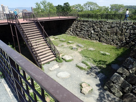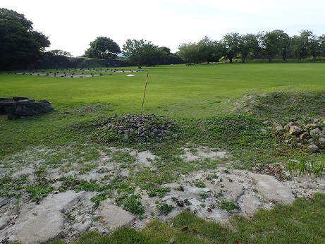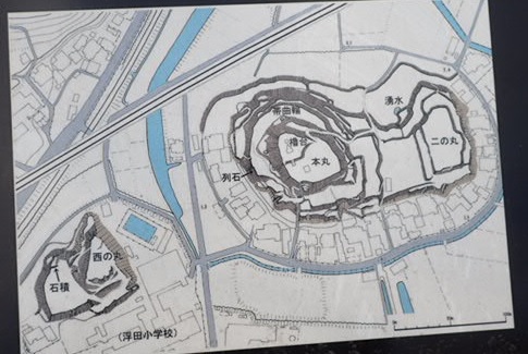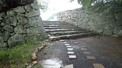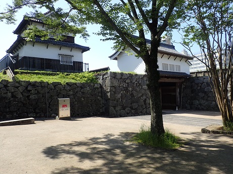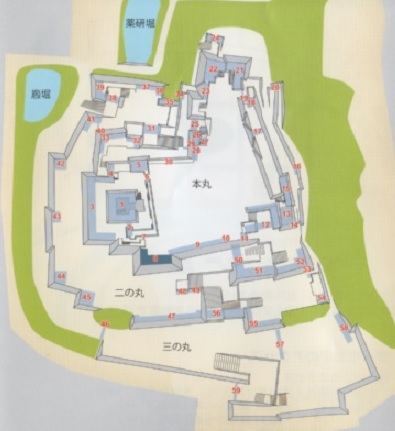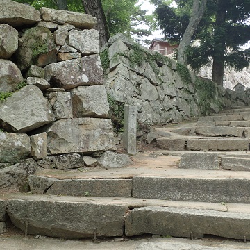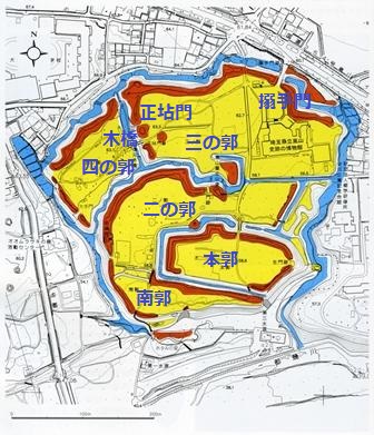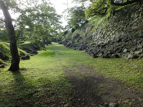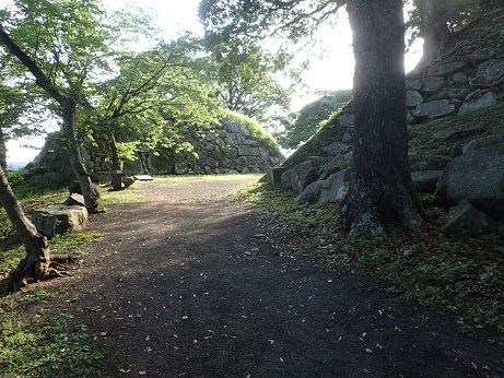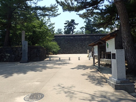 三の門を抜けると二の丸上段にいたり、ここには藩主の御殿があったが、狭いために三の丸(現在市役所がある)にも建てられていた。