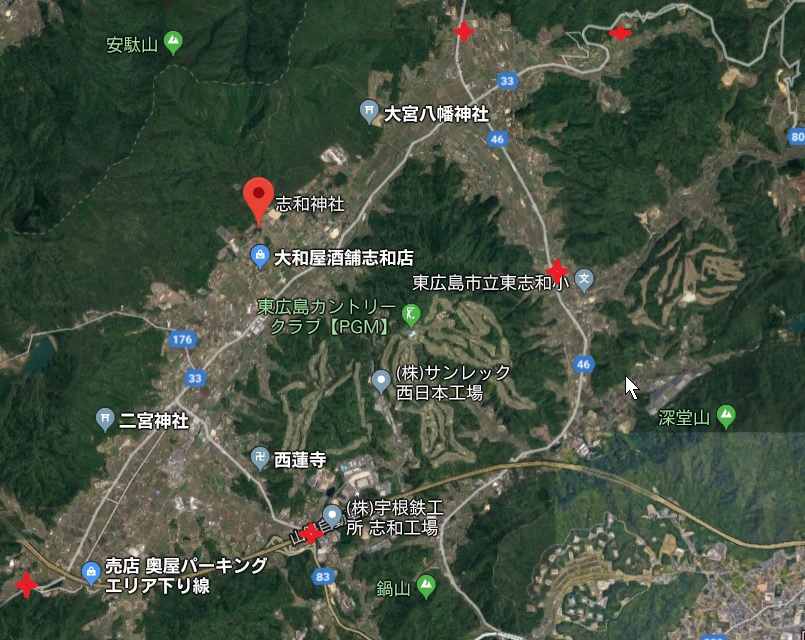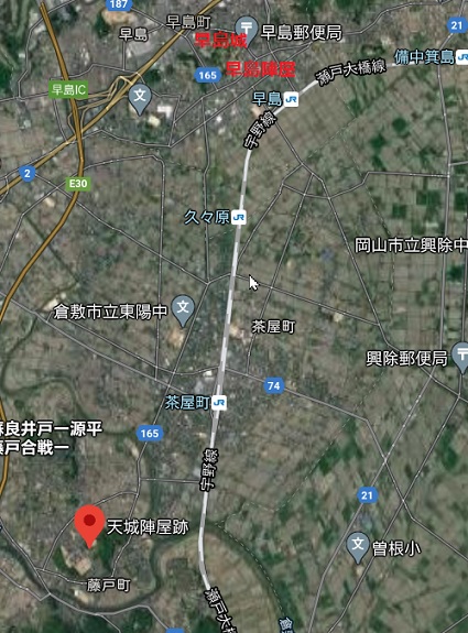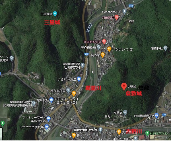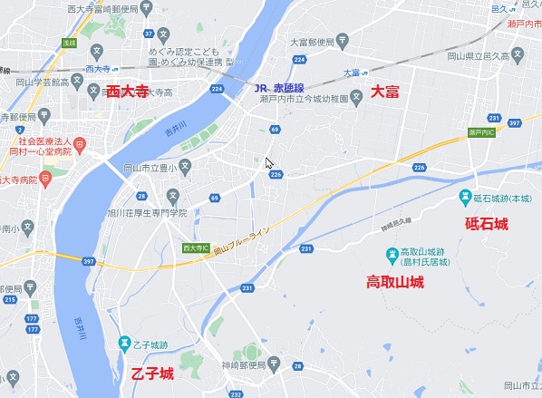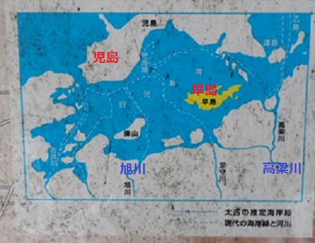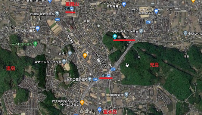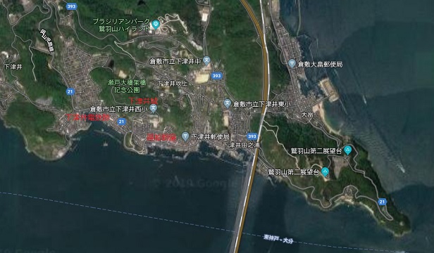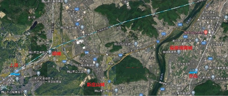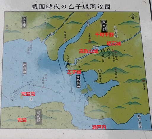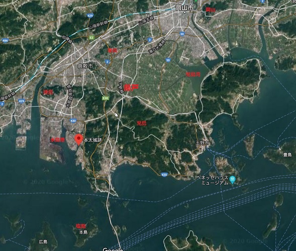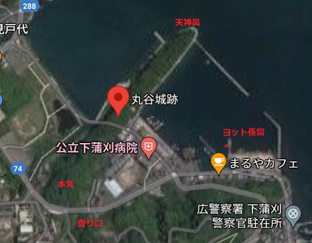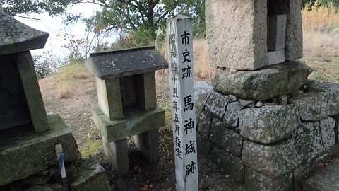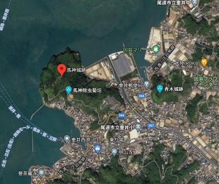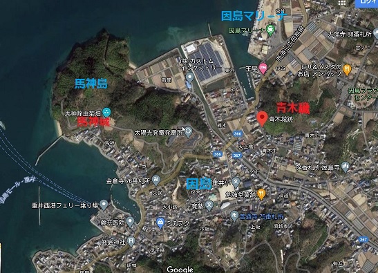 上の衛星写真で青木城と馬神城の位置関係や馬神島であったことが良くわかる。