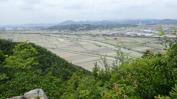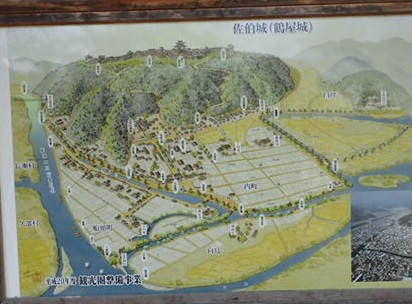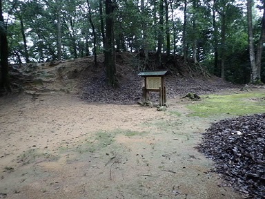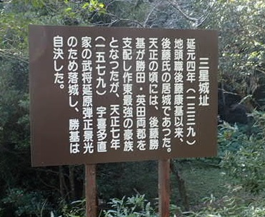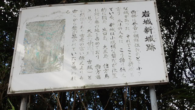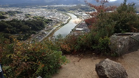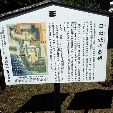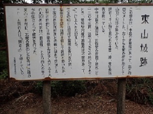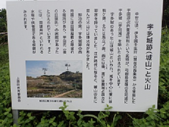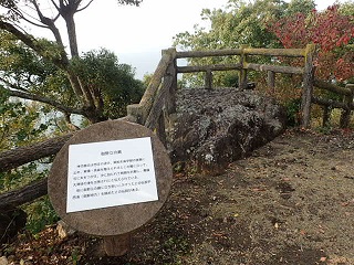 「標高187メートル、中世の模範的な山城と言われています。周辺には寺跡、居館跡、石風呂跡が残っていたと伝えられています。頂上の一の郭には城の守護神がまつられ、二の郭には井戸跡があり一の郭の南側に三の郭の遺構が残っています。この城はお茶を碾く臼によく似ているところから茶臼山城と呼ばれたと言われる。」