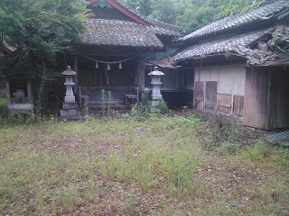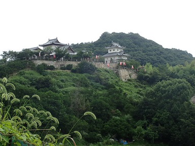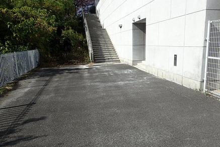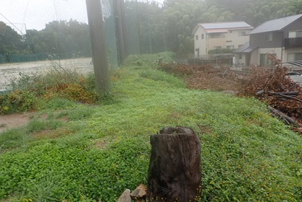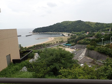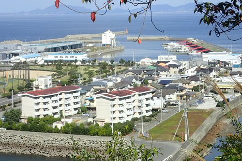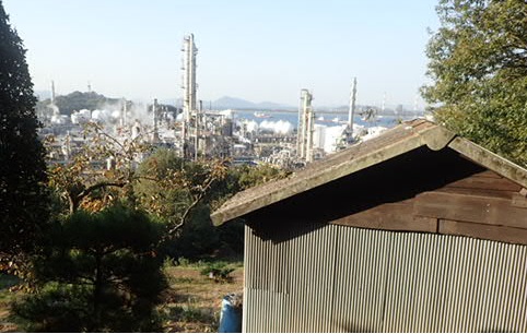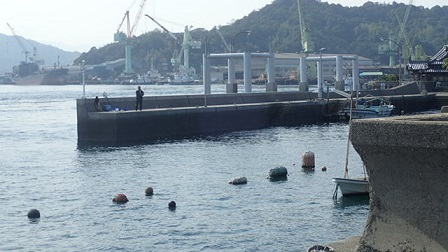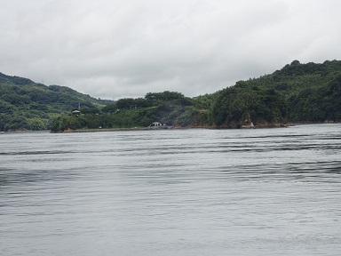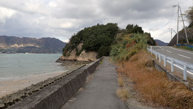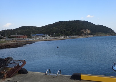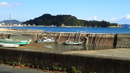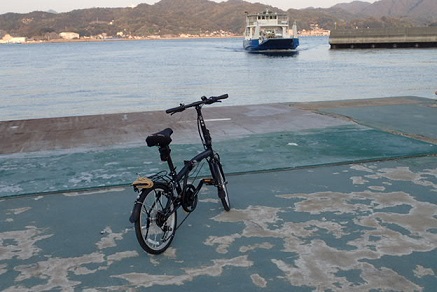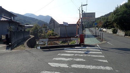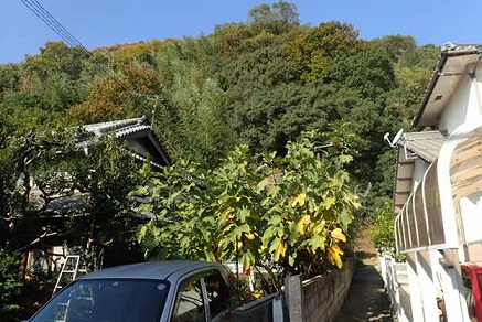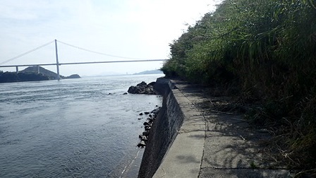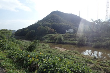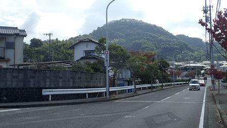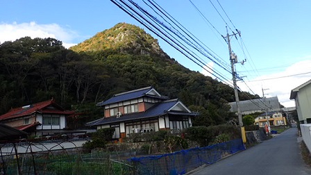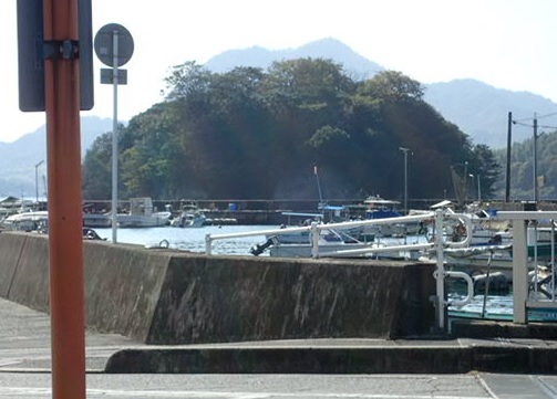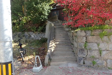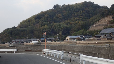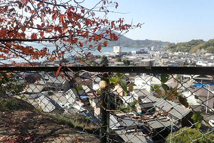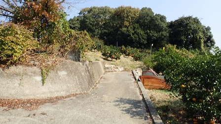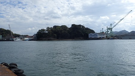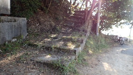 余崎城の帰り・岡島城への往路は1時間余りも峠の頂上まで自転車を押し登りで辛い作業であったが、そこからは向島のフェリ-乗場まで一気に下った。 この近くの造船所の敷地内に岡島城はある。 造船所の守衛さんに尋ねたがご存知なかった。城のふもとの民家の女性に聞いてみると、かってそこには邸宅風の建物があり現在は住んでいないということでした。 登り口を探したが通行禁止の模様。 またしても断念した。