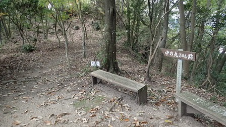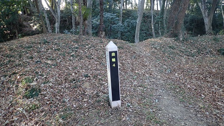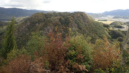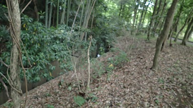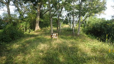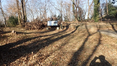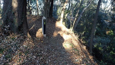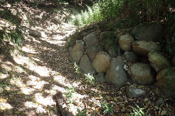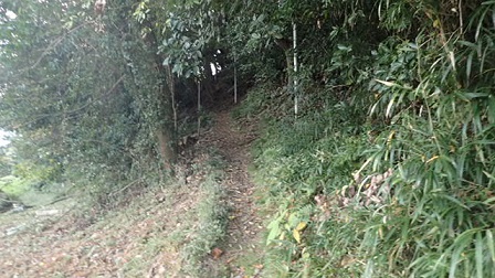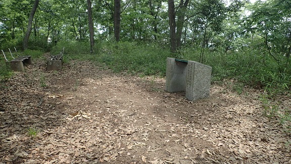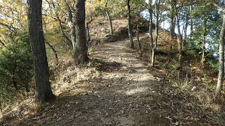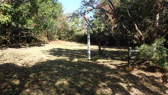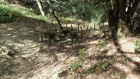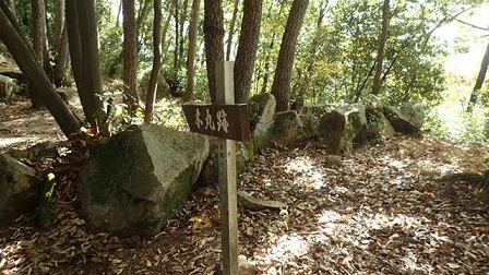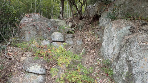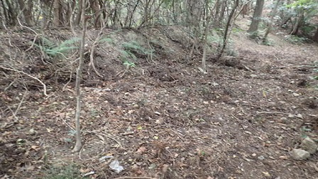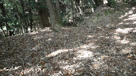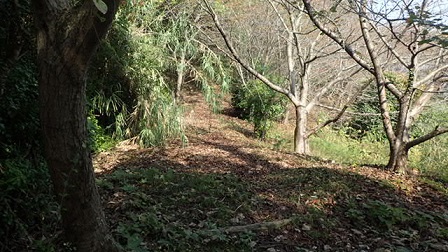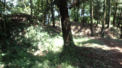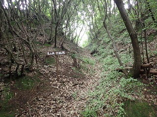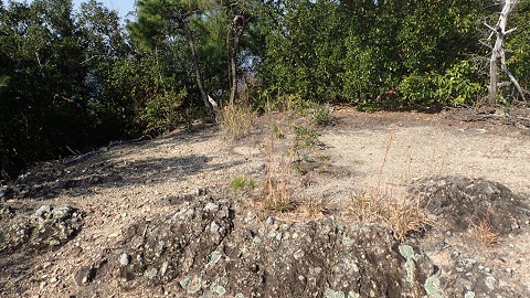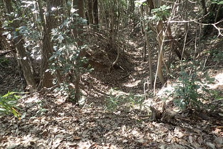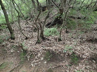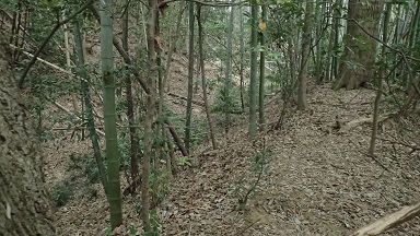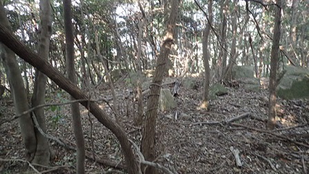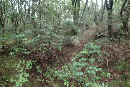 水タンクのようなもので行き止まりとなり、さらに頂上を目指して道の無いところを登って行くと、、それらしくの一番高い場所についた。標識も無いところであった。これより下り路を探したが見当たらない。 より低い位置で通れそうなところを下っていく。往路に出会うとともっていたが1時間ほどしても無い。 焦りを生じた。 途中で土塁に囲まれた郭のようなところへも到達したが、それに続く道も無い。山で迷ったようだ。