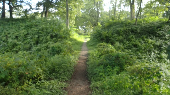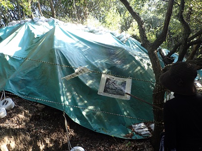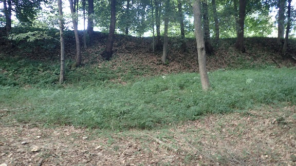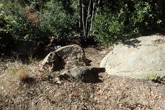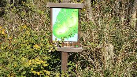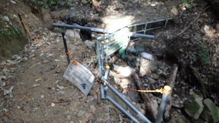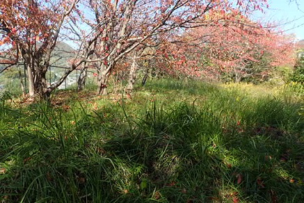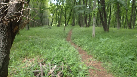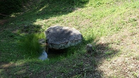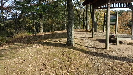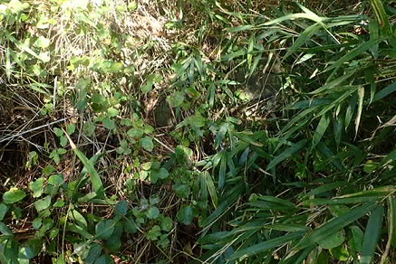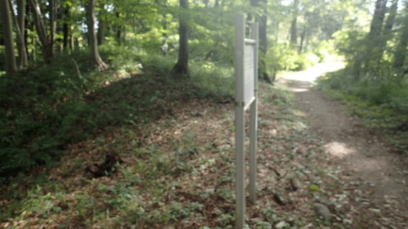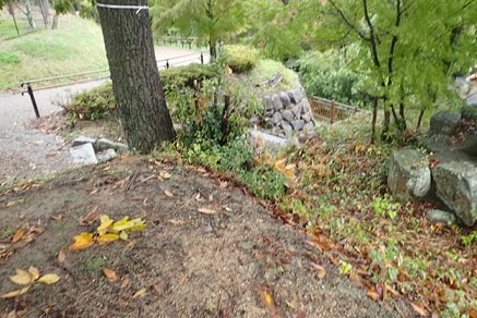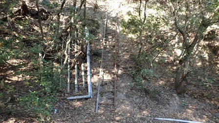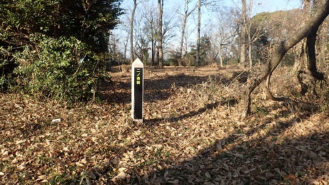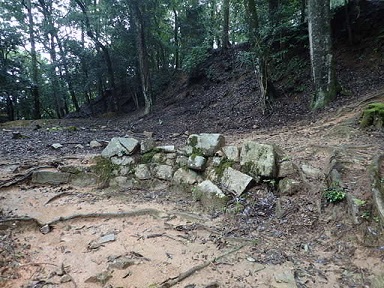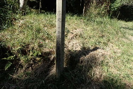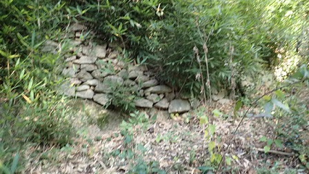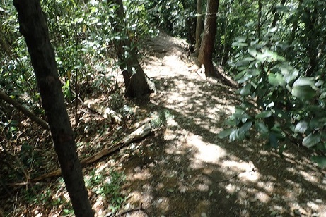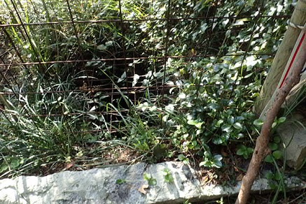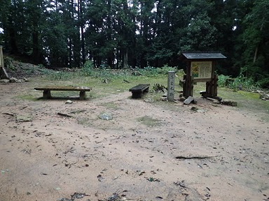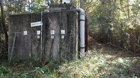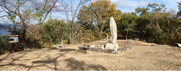 水タンクのようなもので行き止まりとなり、さらに頂上を目指して道の無いところを登って行くと、、それらしくの一番高い場所についた。標識も無いところであった。これより下り路を探したが見当たらない。 より低い位置で通れそうなところを下っていく。往路に出会うとともっていたが1時間ほどしても無い。 焦りを生じた。 途中で土塁に囲まれた郭のようなところへも到達したが、それに続く道も無い。山で迷ったようだ。