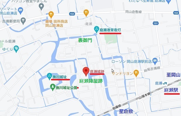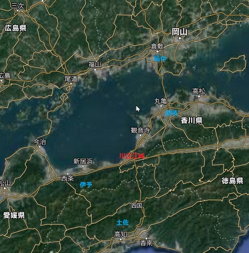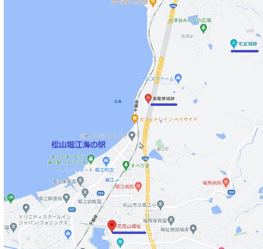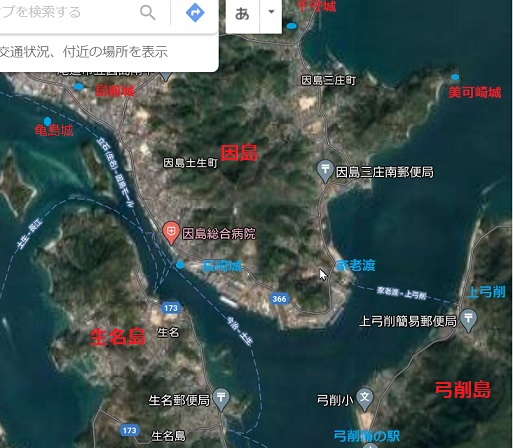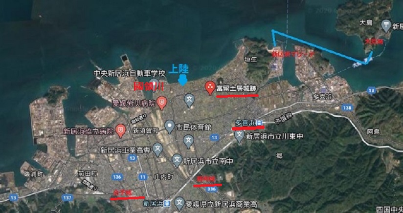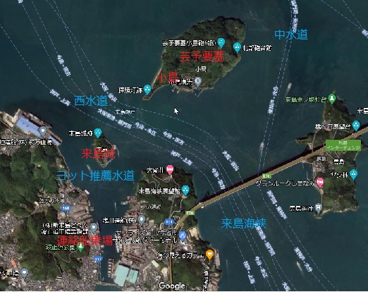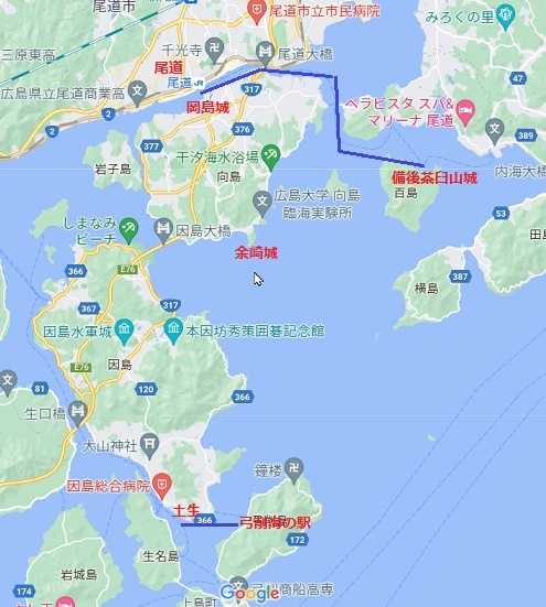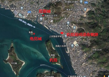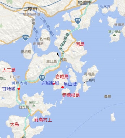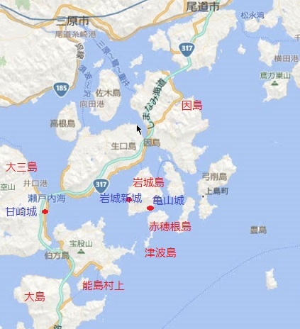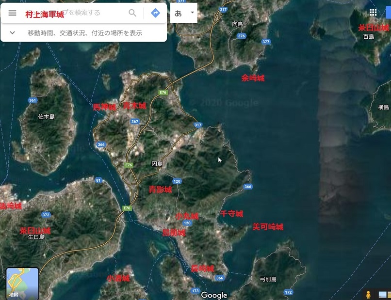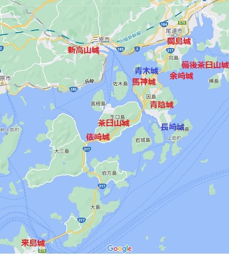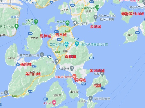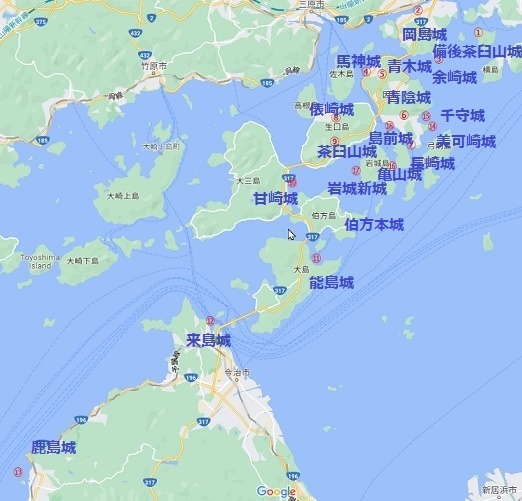 青字は訪れた芸予諸島の海賊城、 赤丸数字は城位置