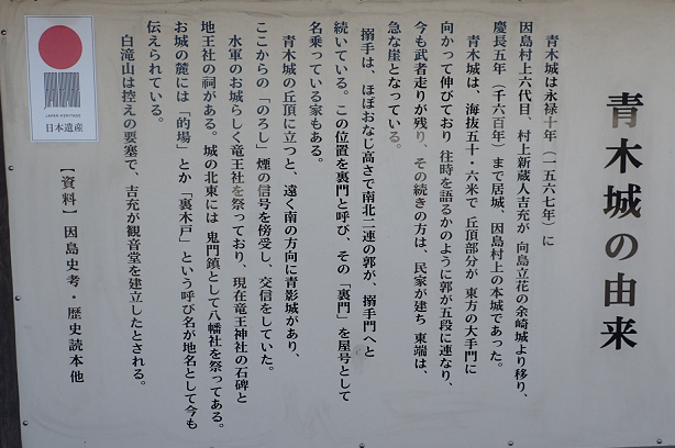 ここは永禄十年(1567年)青木城を築城した因島村上水軍新蔵人吉充の命により築かれ、側用人頭で第五(付)家老・末長有馬介景光(矢治馬介景親)が城将となった。そこには用人四家、小柱二家、使番五家及び大目付二家と十八(横目付)連中を率いて居城したと伝えられる。