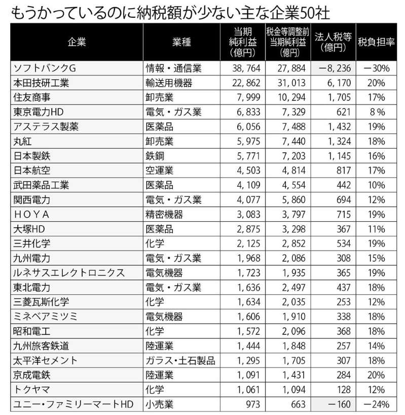 表を見てほしい。東京商工リサーチのデータをもとに、利益が大きいのに納税額が少ない主な企業をまとめたものだ。