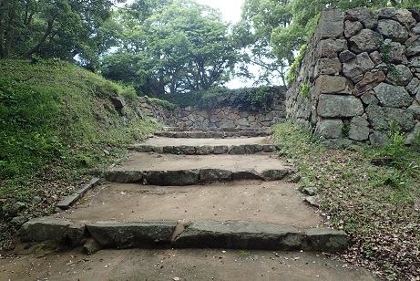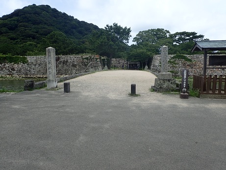 浜田城の南にある資料館の奥には本丸へ行く登り口がある。 登っていくと護国神社に着く。 そこには司馬遼太郎が書いた碑文があるけれど、後で分かったことでそれを見ず。 すぐに門があるがこの城とは関係のない県庁から移築されたもの。 登っていくと本丸跡にたどりるける。 3重櫓の天守があったという。 本丸から少し下って2の門跡に出る。 井戸跡と中の門跡まで来ると山を下った感じだ。 大手門跡は見なかった。