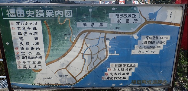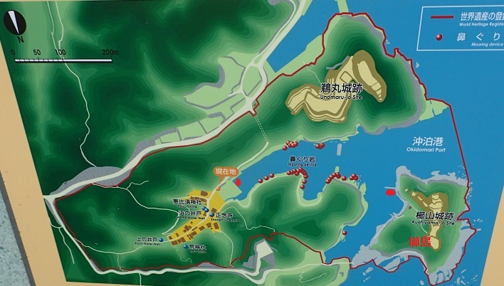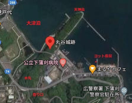 ヨットは天神鼻のある半島状の土地(丸屋城域)東側に着けた。ここはここ10数年前に整備された港域である。 昔は西側に大津泊・湊がありそこは地乗りの航路・沿岸よりの航路の風待ち湊として栄えた。また、水軍城の船隠しもあったという。