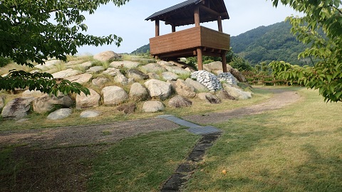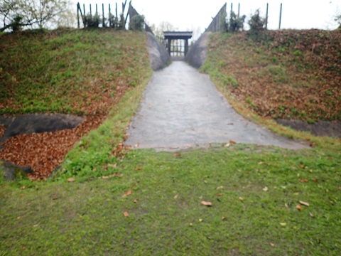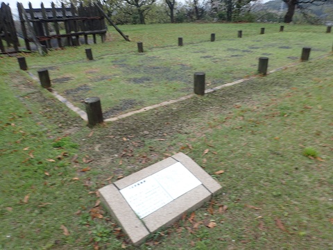 模擬の見張り櫓と冠木門をみることができる。 遺構は見当たらない。