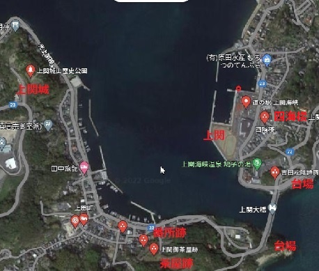 上関城、番所跡、茶屋跡、 赤丸はヨット係留地