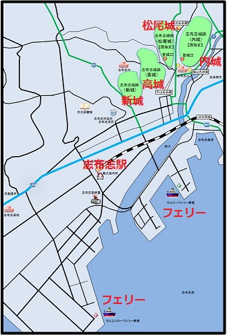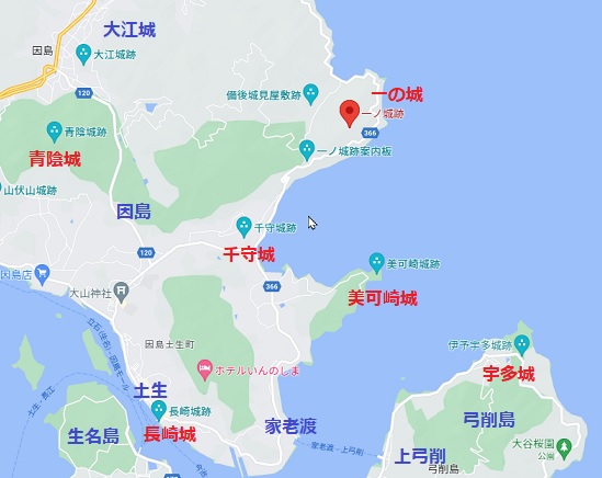 因島周辺の城、 赤字城は訪問済み、青字城は未訪問