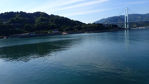 大津泊、現在は面影なし、養殖設備が浮かぶのみ。 右には安芸灘大橋