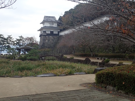 海から模擬天守はよく見える。 そこへ行くのは少し長い坂道を登っていかなければならない。 天守は現在閉館中の歴史館である。 隣接して岩がヶ峰古墳跡がある。